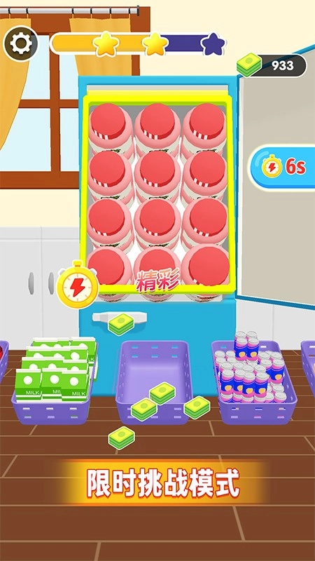 4、有趣的冰箱整理闯关内容,主要任务就是把各种各样的物品放置到冰箱里面,考验玩家的手速和思维能力,合理的摆放,冰箱看起来就会更加舒适,不断的进行闯关,解锁新的内容。
