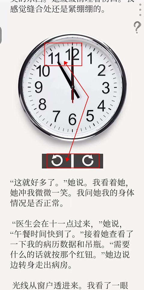 2、护士告知,医生会在十一点的时候过来。此时需将时钟调节至11:00(通过按钮1可控制分针逆时针旋转,按钮2则能控制分针顺时针旋转),之后便可继续推进剧情。