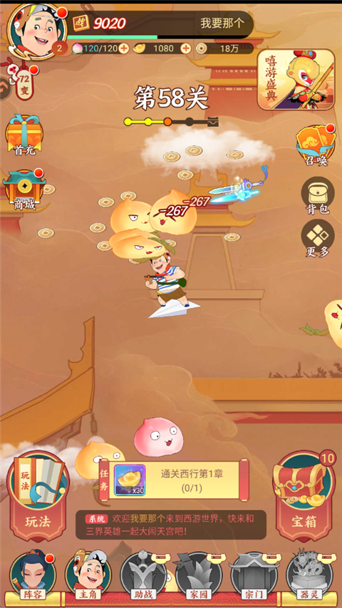 《闹闹嘻游》是一款基于《西游记》蓝本改编的放置挂机与卡牌收集相结合的游戏。它采用经典的上影美术片风格,搭配忠于原著的剧情,涵盖九九八十一难,玩家将伴随主角开启冒险之旅。在玩法方面,《闹闹嘻游》运用全自动挂机战斗模式,玩家只要上线就能自动闯关获取宝箱,通过开启宝箱得到资源和其他角色。游戏中设有仙、人、佛、妖四类角色,玩家可从中挑选6名进行闯关挑战。