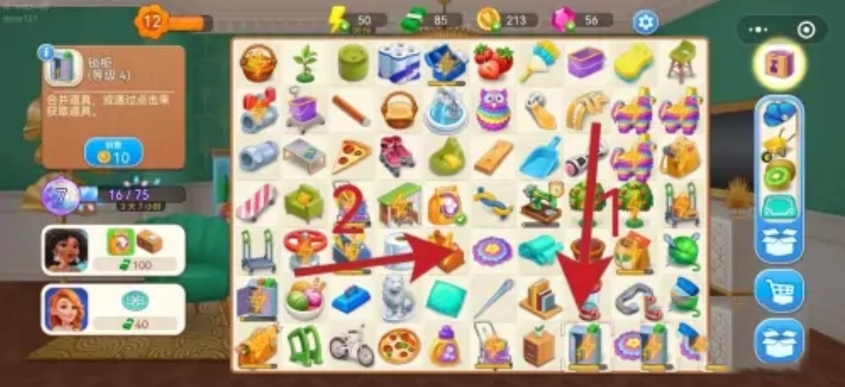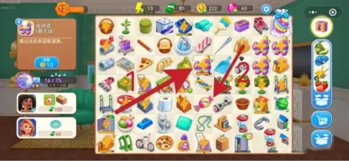 进入微信小游戏欢乐假日爱消除后,第一步要点击锁柜道具,这样就能得到两个皮纳塔1以及对应的道具,接着把这两个皮纳塔1和它们的道具合并,合称为皮纳塔2及道具。