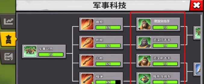 军事科技里的T2兵种,像资深突击手、资深打击手、资深射击手还有履带攻城车,得抓紧解锁才行。毕竟T2兵种是能碾压T1兵种的。
