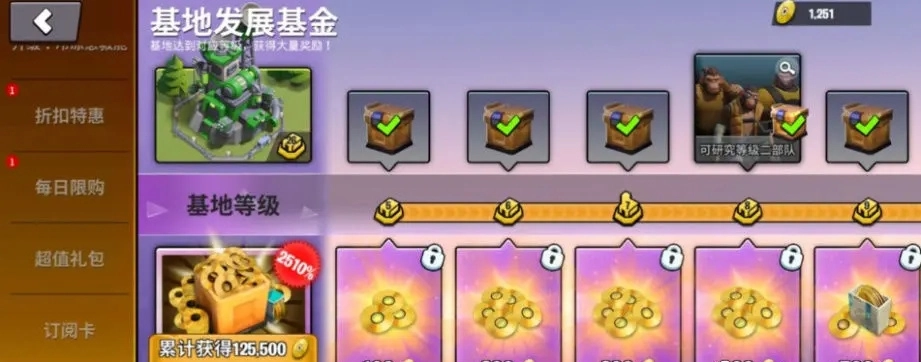 基地总共设有30个等级,每当提升一级,都能从基地发展基金里领取宝箱奖励。