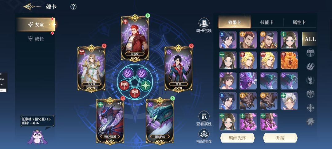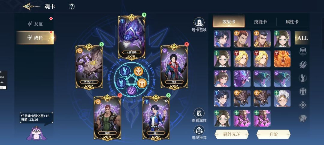 玩家在前期阶段可以自由强化魂卡,强化操作后支持回退功能,回退时会全额返还强化所消耗的材料;即便当前强化的魂卡并非所需,后续获取到目标魂卡后,也能先回退已强化的魂卡,再用返还的材料强化新获得的需要的魂卡。下图将展示魂卡达到SSR品质后的具体属性,以及魂卡羁绊的触发条件,魂卡的属性构成依次为四维属性、基础属性与羁绊属性。