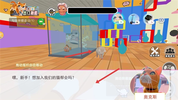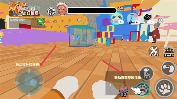 拖动摇杆就能自由移动,滑动屏幕可以旋转视角,在房间里四处探索,周围分布着各式各样的装饰与角色,开启一段充满趣味的捣蛋之旅。