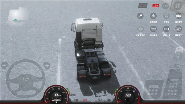 点击右上角的菜单按钮,接着点击左侧的钥匙图标来启动卡车,之后就可以通过操作踏板来驾驶了。方向盘对应的是车辆的转向控制,右侧的踏板分别是刹车和油门,而油门上方的装置则用于切换前进挡和倒挡。