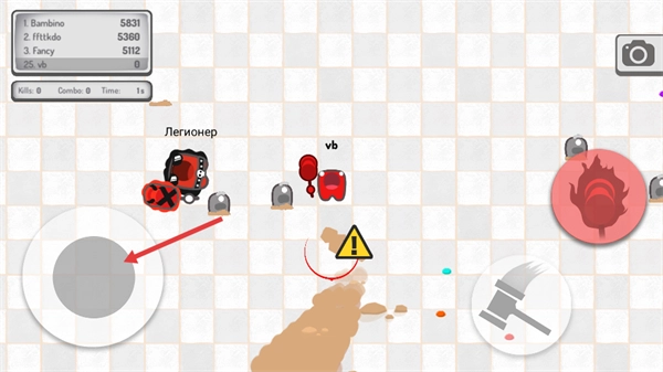 玩家借助虚拟摇杆操控果冻角色的移动,同时点击攻击键挥舞大锤攻击周围的其他果冻玩家。