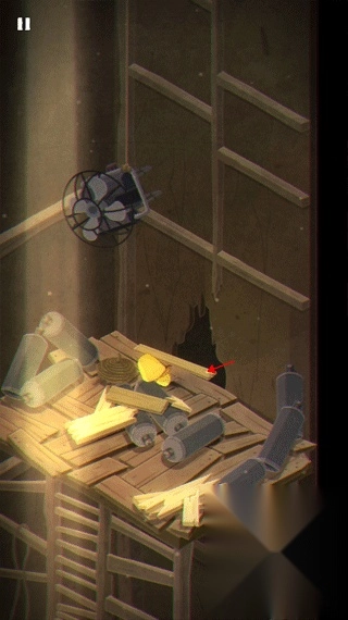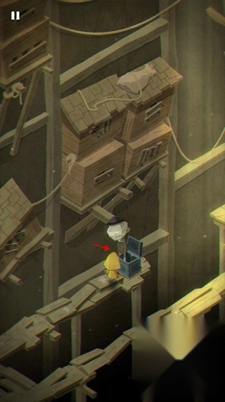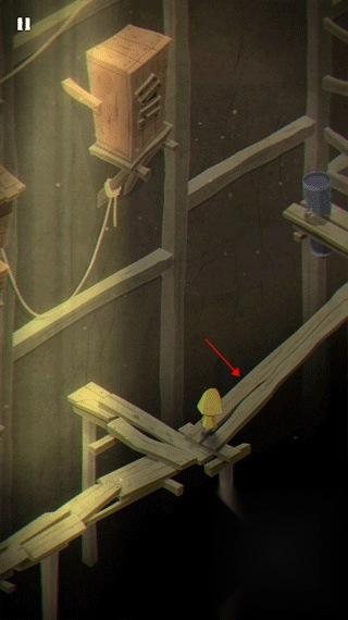 摩诺避开木桶,朝着楼梯向上攀爬,只要使劲挪开这两块木板,就能进入下一个关卡了。