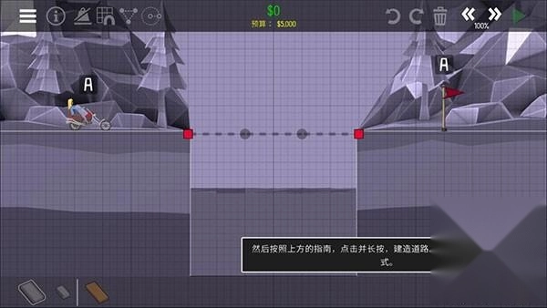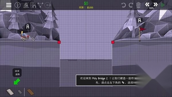 欢迎来到桥梁建造师2!让我们搭建一座桥梁,跨越这道鸿沟吧!首先,请点击左下角的材料类型,选择道路材料。