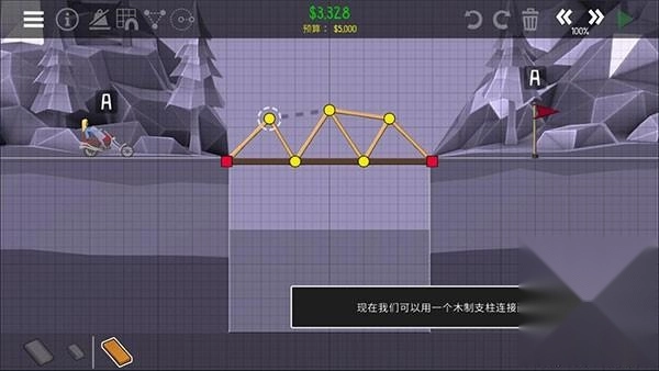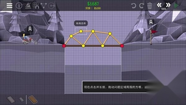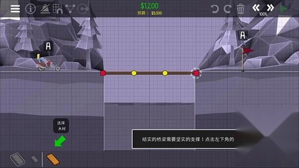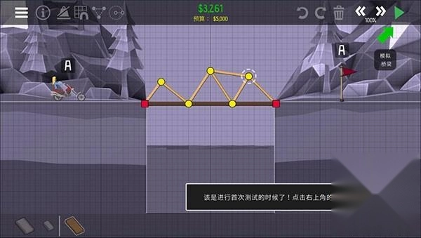 现在是时候开展首次测试了!请点击右上角那个绿色的播放按钮,来进行桥梁模拟操作。