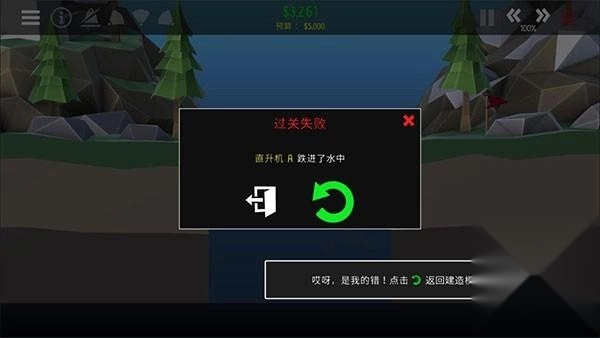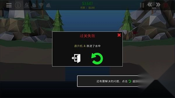 还是没能成功过关,直升机A坠入了水中,目前还有待解决的问题,点击绿色的返回按钮,重新回到建造模式。