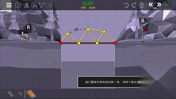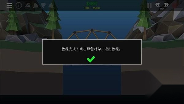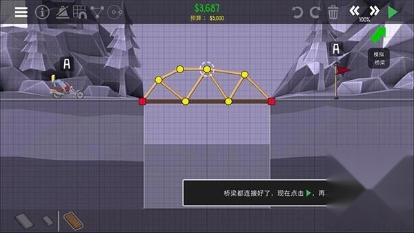 桥梁已全部连接完毕,现在请点击绿色的播放按钮,重新进行模拟尝试。