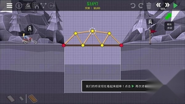 我们的桥梁现在看起来棒极了!点击那个绿色的播放按钮,重新进行模拟,这次肯定没问题!