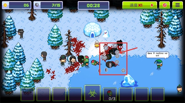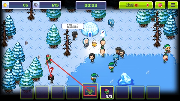 在冰雪场景中,要留意【06】金币和【1/15】的僵尸进度,借助界面里【3/3】的【病毒】道具,对目标角色实施感染来推动进程。