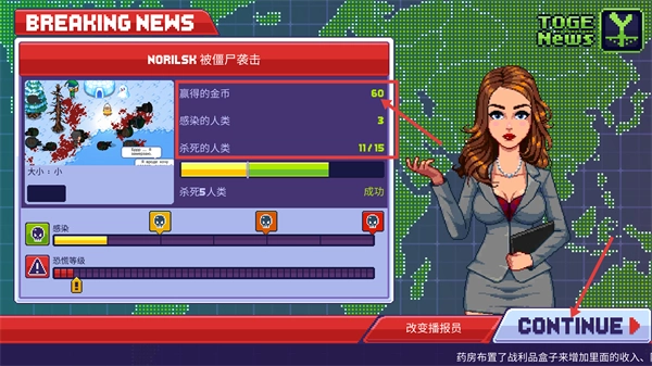 完成感染后会出现【BREAKING-NEWS】提示,内容显示为【NORILSK-被僵尸袭击】,同时可获得【60-所得金币】等奖励,点击【CONTINUE】按钮即可进入后续环节。