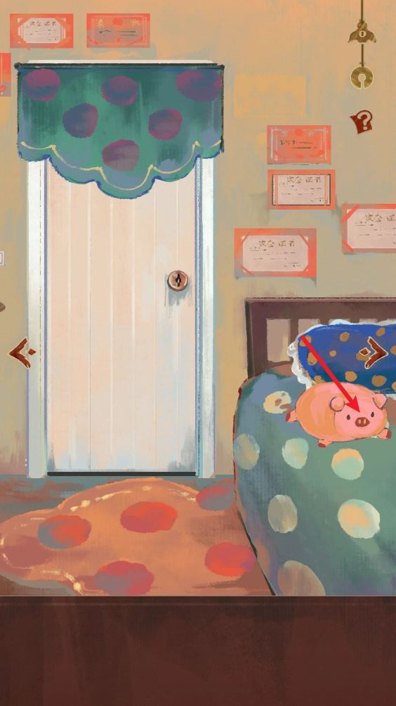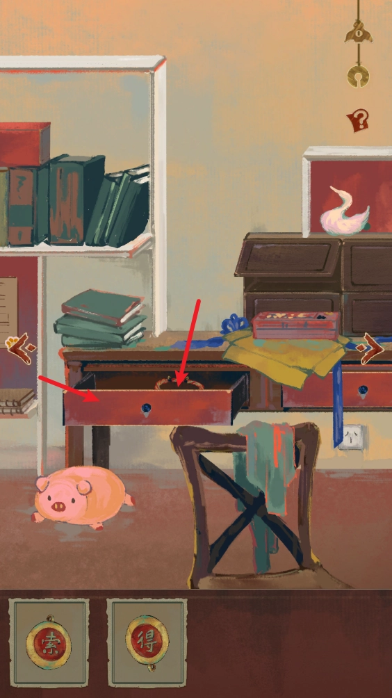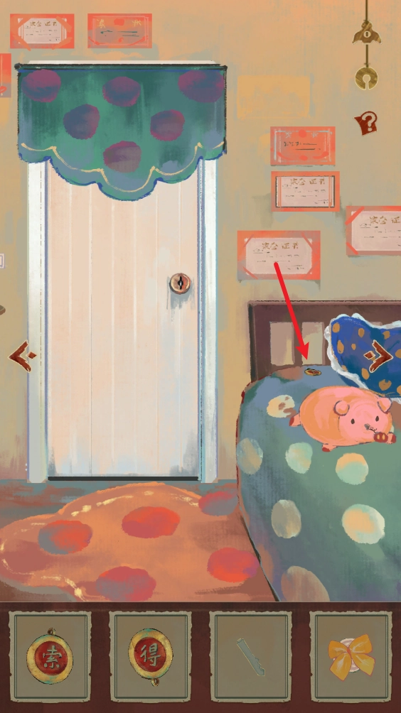 首先收集物品,猪鼻子要“索”,柜子里找到“得”,枕头下面拿到“男”。