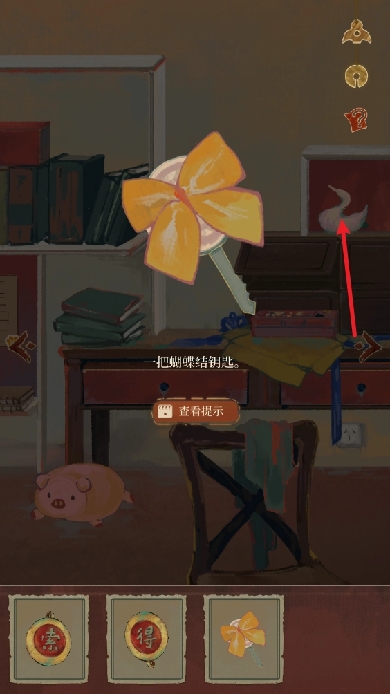 点击图中的这只鸭子,就能得到普通蝴蝶结,接着把钥匙拖过去,就能组合成一把完整的钥匙了。