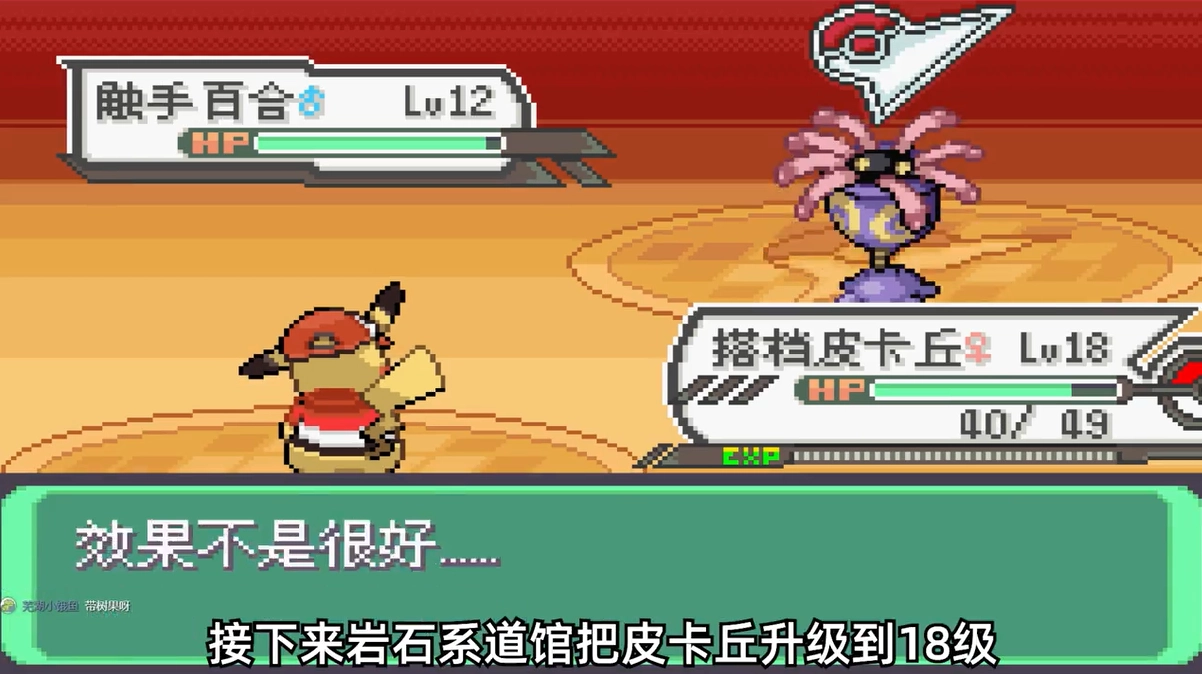 皮卡丘:离开新手村后,我们能在橙华森林的大木博士那儿领到皮卡丘或者伊布。推荐选择皮卡丘,之后针对岩石系道馆,把皮卡丘练到18级,就能直接一路单挑通关了。