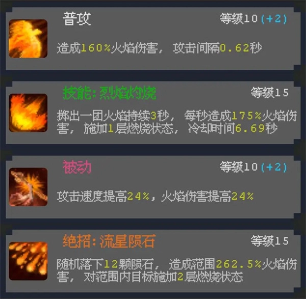 火岚的技能加点方案为10+15+10+15。由于火岚的三阶技能能力会在使用技能后增加怒气,因此该技能必须加到15点,这样能让火岚更快释放绝招;而绝招加到15点,主要是因为其三阶能力可带来属性加成。综合来看,这样的技能加点对火岚而言较为合适。