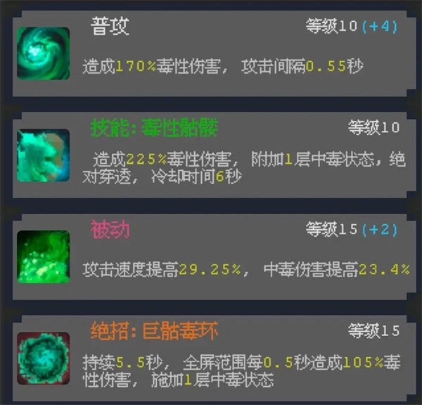 毒夫人的技能加点方案为:10+10+15+15,依照这个加点方式来操作,角色的实力想必不会弱。