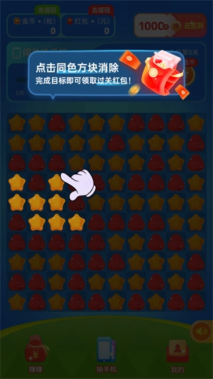 玩家能够直接进行签到,若连续签到满3天,即可直接领取0.3元红包;通过消除方块闯关可获取金币,金币按特定比例也能兑换为红包。