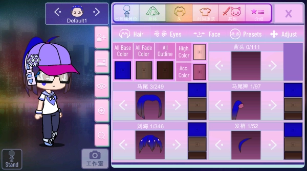 接下来要进行头部的调整,马尾、刘海、发梢这类细节都能单独选择,还可以对发色进行调整。