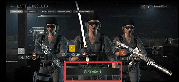 游戏结束后,你还能查看自己的战绩;要是还想和队友再玩一局,点击play again就可以了。
