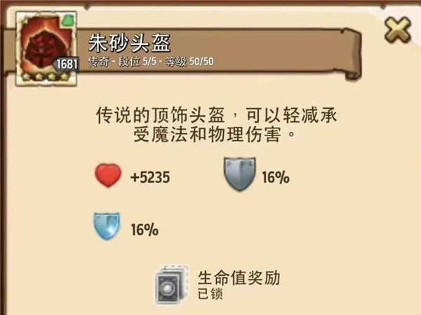头盔:朱砂头盔,具备16%的双抗属性,还带有血量加成,外观设计也颇为美观。
