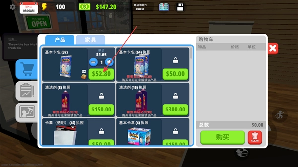 进入产品界面后,找到基本卡包,借助加减按钮调整购买数量,查看对应的价格,把该物品添加至购物车,方便后续进行购买。