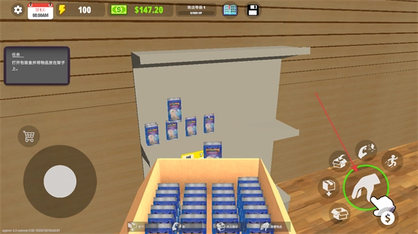 3、依据“打开包装盒并将物品放置到架子上”的任务要求,在打开包装盒之后,可通过点击右下角的手掌按钮,将物品放置到对应的架子位置处。