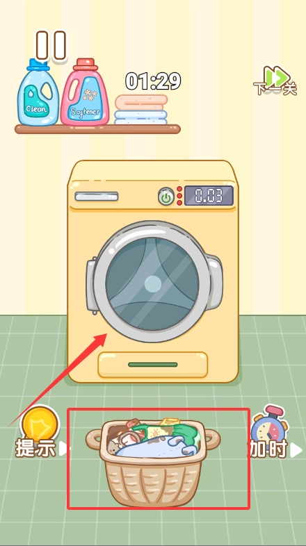 3、进入关卡后,把衣服丢进洗衣机洗即可过关。