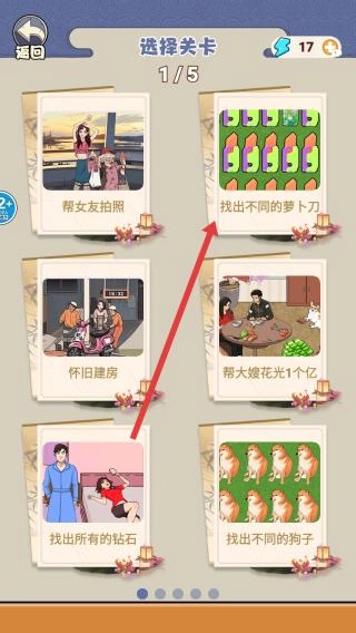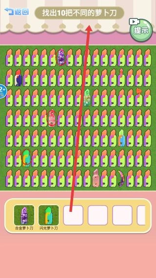 1、玩家进入游戏后,可选择“找出不同的萝卜刀”关卡开启挑战,需识别出10把具有独特设计的萝卜刀。