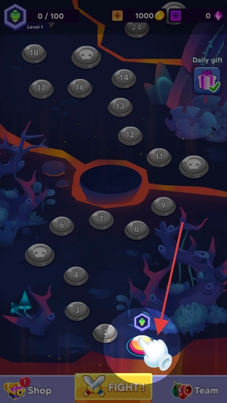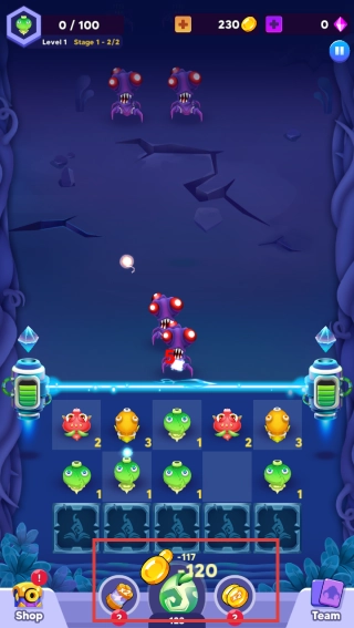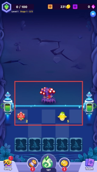 2、战斗过程中,可运用下方的技能(如绿球、金币),与上阵的彩色生物相互配合,对紫色怪物发起攻击,同时把控好血线,以此争取胜利。