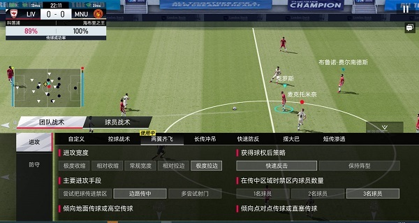 4、团队战术:玩家能够借助「团队战术」功能自主规划球队的整体进攻与防守策略,实现赛场上的宏观战术部署。此外,也可以直接选用已有的成套战术,例如两翼齐飞、快速防反等,同时还支持对这些现有成套战术进行细节上的调整优化。