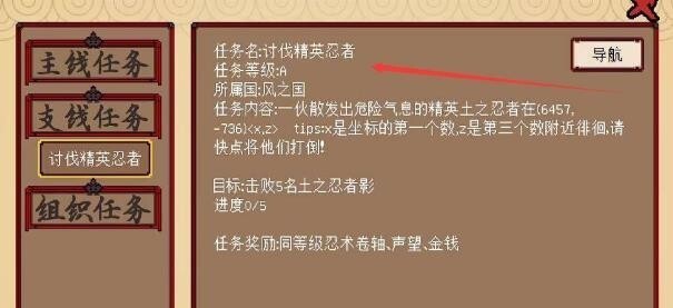 2、或者晋升为中忍后,找到NPC接取情报转移任务,携带任务抵达目的地后右键打开(任务会失败),相应数值便会增加。