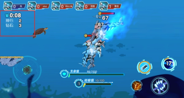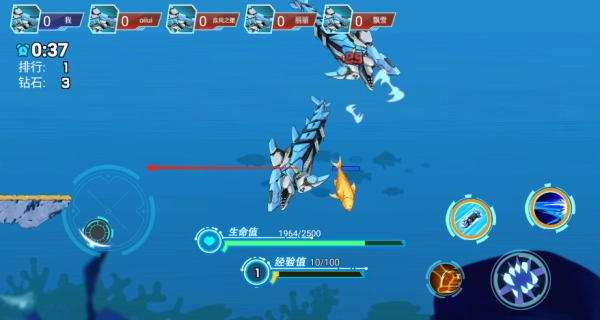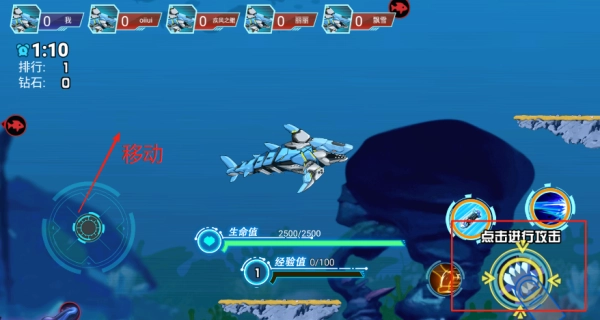 1、利用方向键操控机甲鲨鱼的移动,同时搭配攻击键来消灭场景里的全部敌对目标。