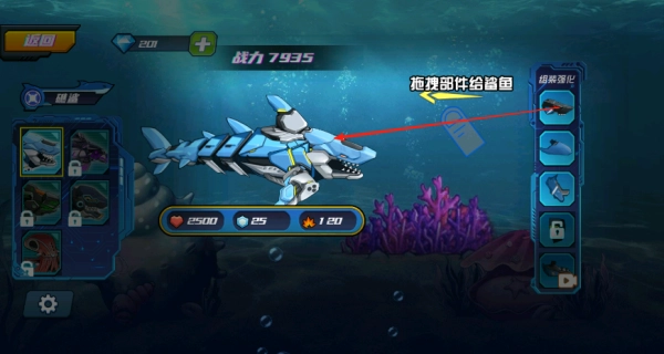 3、收集到的稀有机械零件会实时装配于鲨鱼体表,其外观会随装备的升级持续发生变化与进化。
