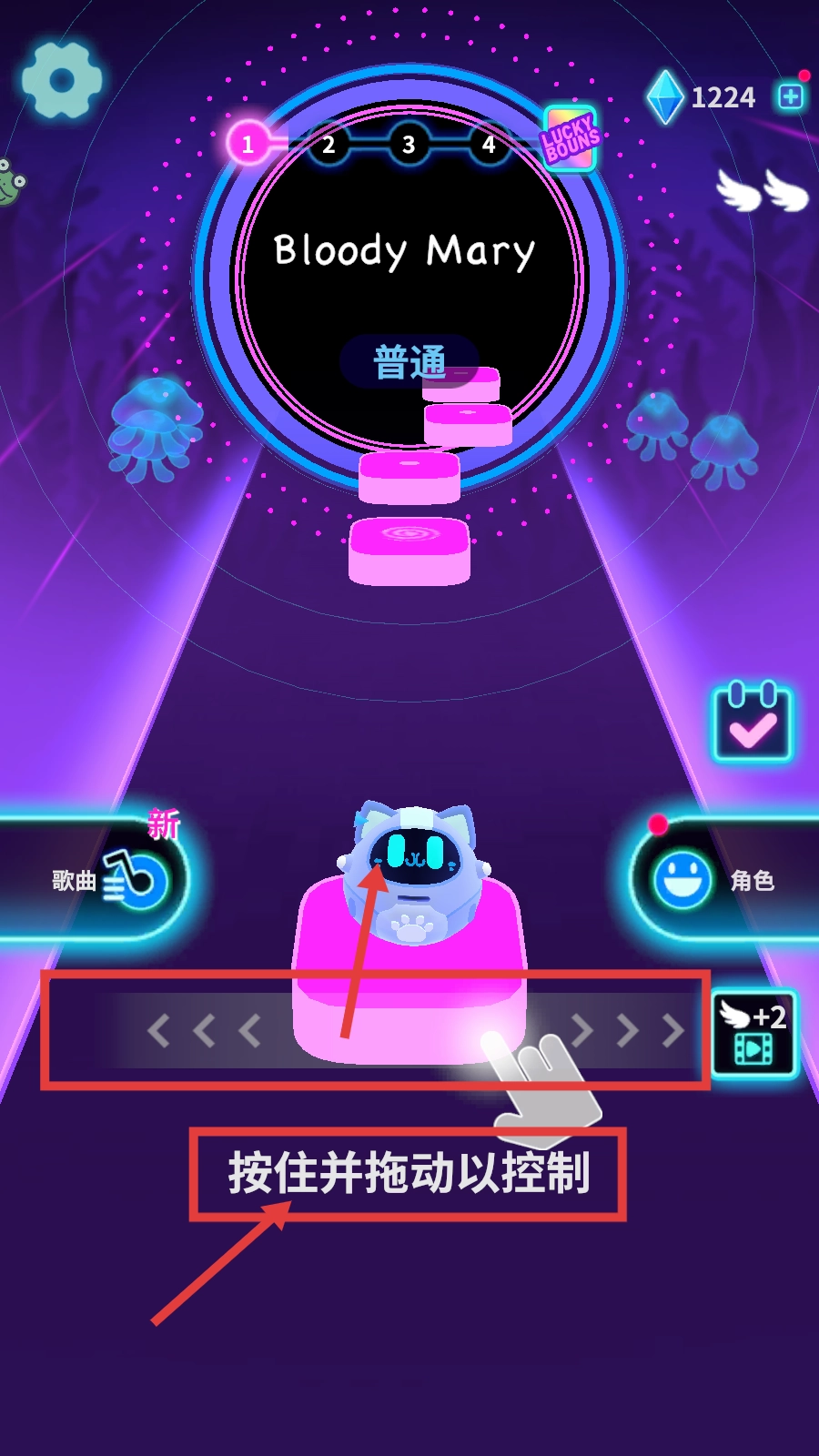 1、挑选【BloodyMary】这首歌曲的普通难度,依据“按住并拖动来操控”的提示操作角色,开启音乐闯关的旅程。