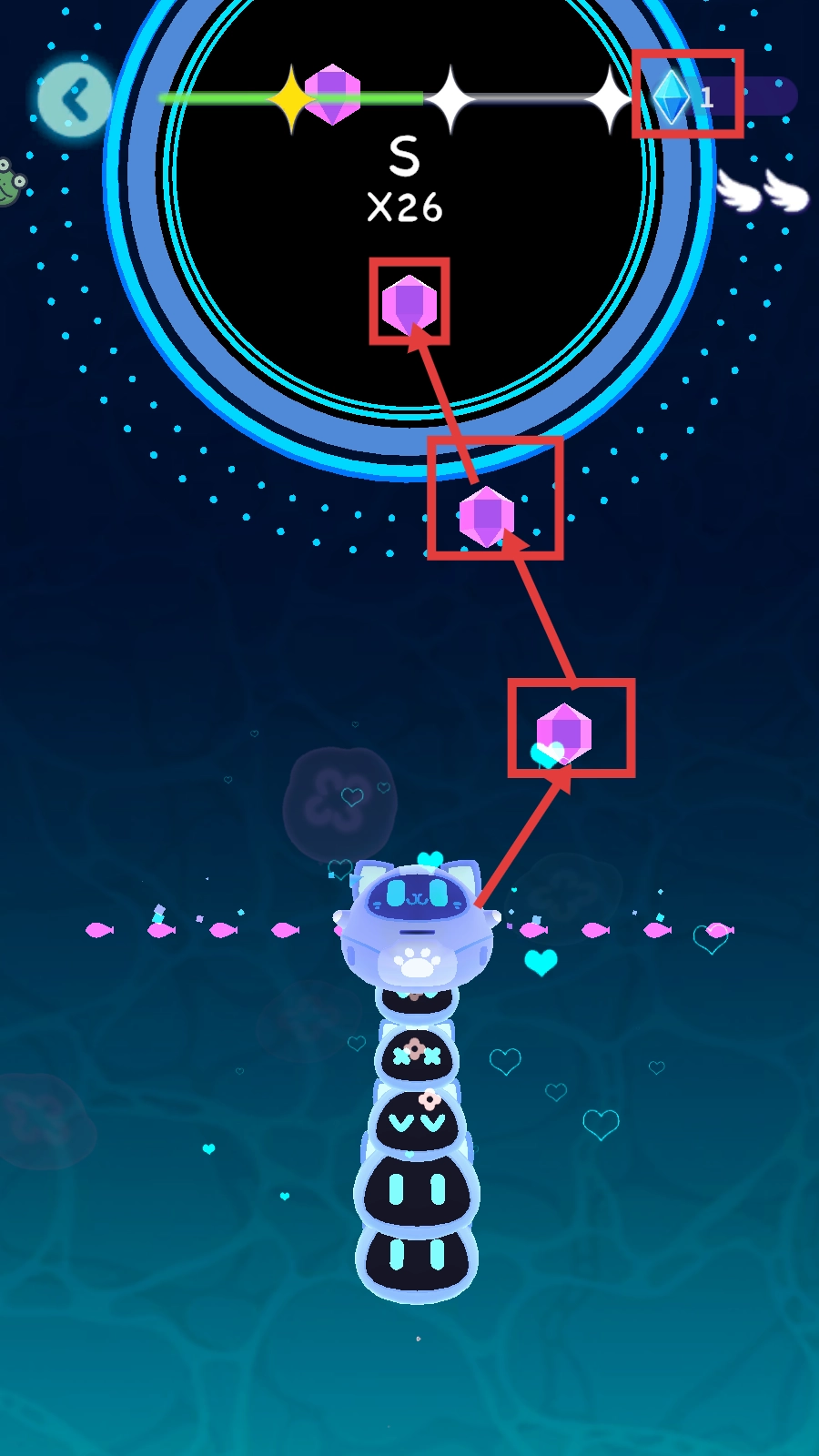 3、在闯关过程中收集【紫色宝石】,能够累计获取【钻石-1】,同时将评分提升至【S×26】,以此增加游戏收益。