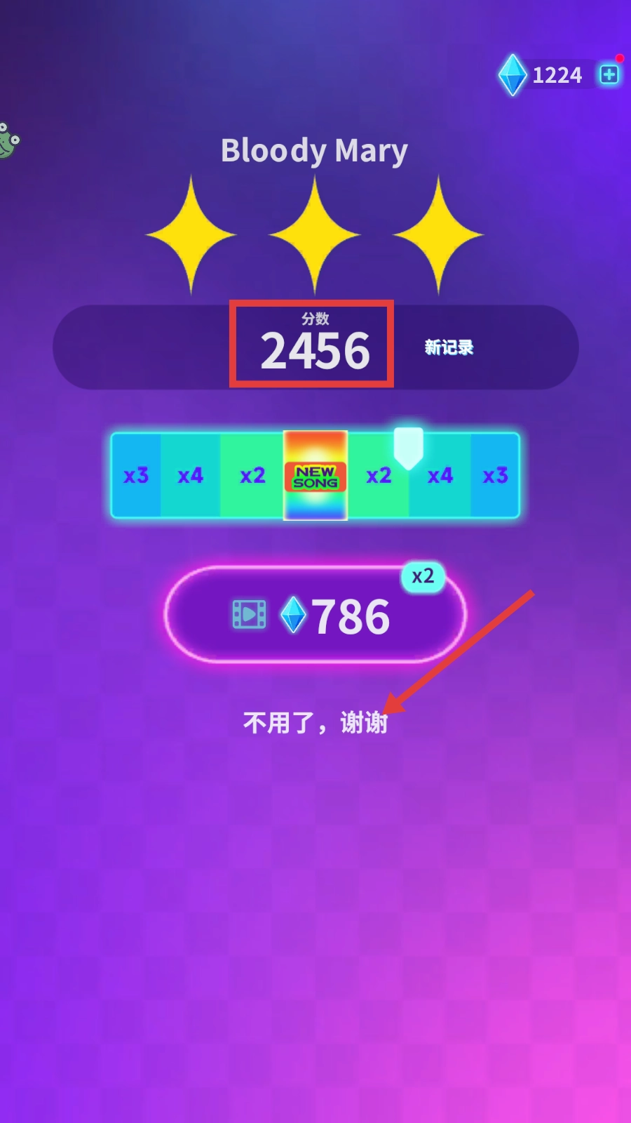 4、通过【BloodyMary】关卡后,刷新了【分数-2456】的新记录,点击【不用了,谢谢】按钮完成结算操作,即可继续挑战其他歌曲。