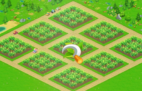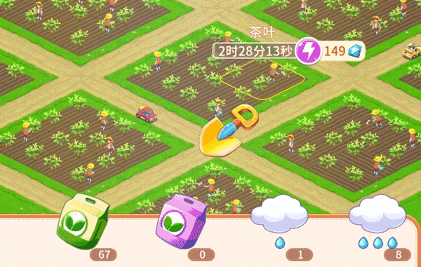 4、每种作物在不同生长阶段会呈现出不同的形态特征,以此来区分其生长状态。当作物成熟后,点击成熟的农作物,界面会出现一把镰刀图标,此时拖动镰刀图标,向所有成熟的作物方向滑动,就能完成对成熟农作物的收割操作。