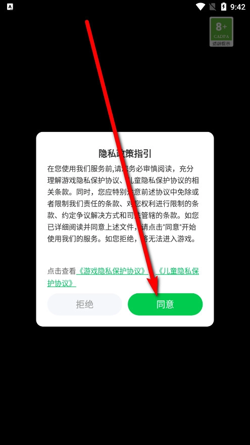 1、仔细阅读游戏隐私政策指引,点选【同意】进入。