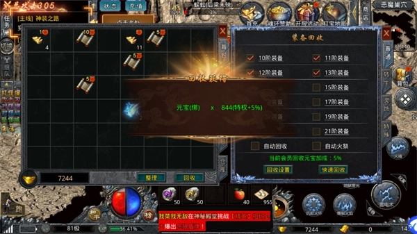 4、回收完成之后就可以获得对应的元宝以及特权。
