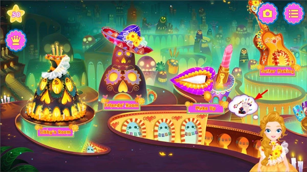 1、启动莉比小公主寻梦音乐会游戏并进入游戏主页后,玩家会看到游戏包含多个不同板块,如莉比的房间(libby's room)、朋友的房间(friend's room)、化妆间(Make up)、吉他房(guitar making)、美甲店(nail salon)等,接下来玩家可点击查看页面右下角莉比的需求。