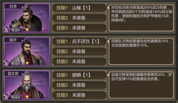 有三位特定武将能组成攻城器械相关的阵容关联,激活后可为队伍提升3点攻城属性,无论什么类型的玩家都适合去培养这个组合。不过要格外留意,其中有一位武将的技能千万不能升级,一旦升级就会大幅削弱整个队伍的输出能力。
