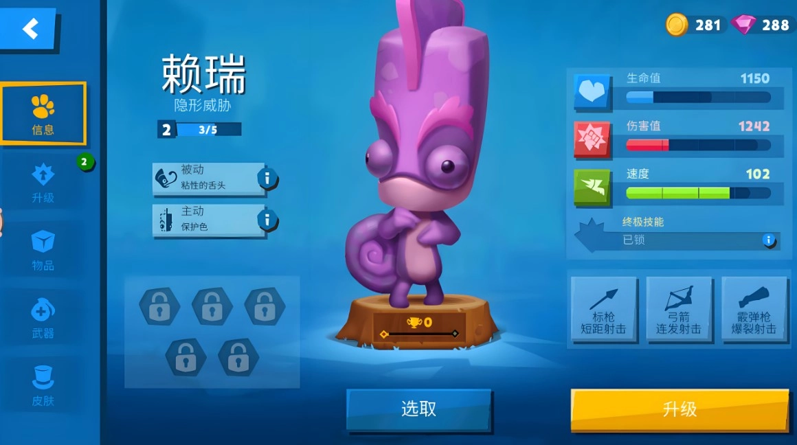 这只名叫赖瑞的变色龙天性怯懦,最擅长的本事是借助“保护色”在瞬间融入环境,以此躲避天敌的伤害。它的被动能力让它能用舌头把散落的战利品卷到自己身边,这种特性在争抢高级装备时格外实用。赖瑞能使用标枪、弓箭和霰弹枪这类武器,无论是近距离搏斗还是远距离攻击都能应对。
