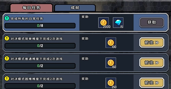 游戏内设有成就机制,达成特定目标即可解锁对应的奖励,不过每个成就任务都仅限完成一次。