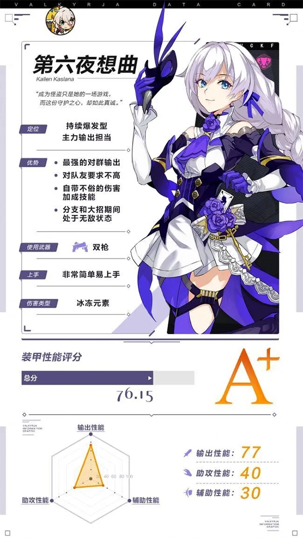 这是一个定位在战场环境下的功能性角色,前期阶段作用比较有限。需要提升到SS阶级才能解锁其主要的输出能力,SSS阶级则会解锁双闪避机制。该角色对超限武器的依赖度较高,建议在账号等级达到81级之后再考虑投入资源进行培养。