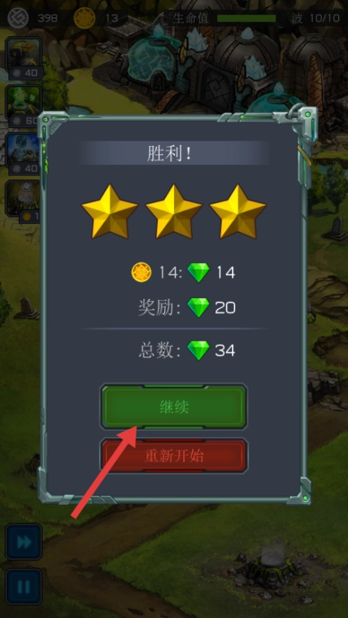关卡获胜后点击【继续】按钮,领取对应的奖励,即可开启新一轮的关卡挑战。