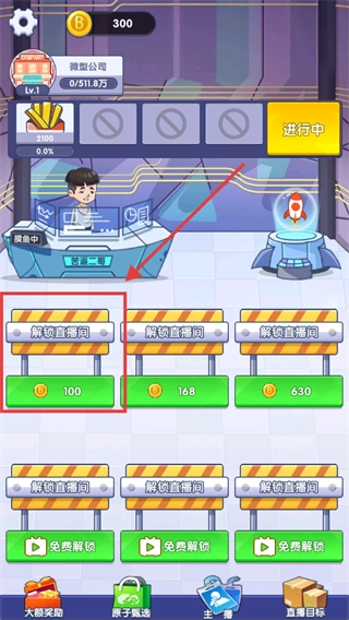 积累不少于【100】金币后,点击【解锁直播间】板块下的【100】按钮,即可解锁新直播间以拓展平台规模。