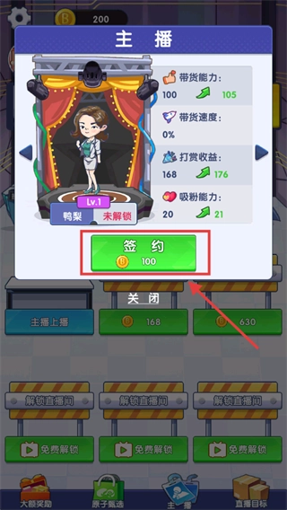 当你拥有100枚金币时,可点击“签约”选项下的“100”按钮,签约“鸭梨”主播以增强带货能力。
